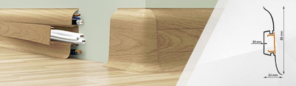 Плинтус состоит из двух частей - базовой планки и маскирующего элемента. Это позволяет закрыть кабели, идущие вдоль стен. Преимущество  в том, что при необходимости получения доступа к проводке не нужно снимать плинтус целиком. Достаточно снять маскирующий элемент. Все углы и заглушки выполнены в древоподобной структуре. Соединетельные элементы в полных цветовых гаммах есть в наличии.